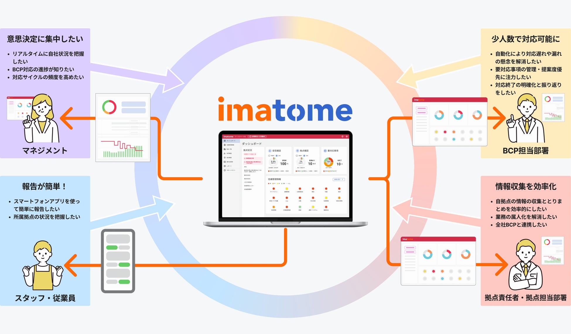 安否確認・拠点確認・要対応事項の進捗など、6つの機能の連携によってBCP対応時に必要な「いま」の状況把握と共有が可能なimatomeは、自社の事業継続に必要な一連の対応の早期収束に貢献します。