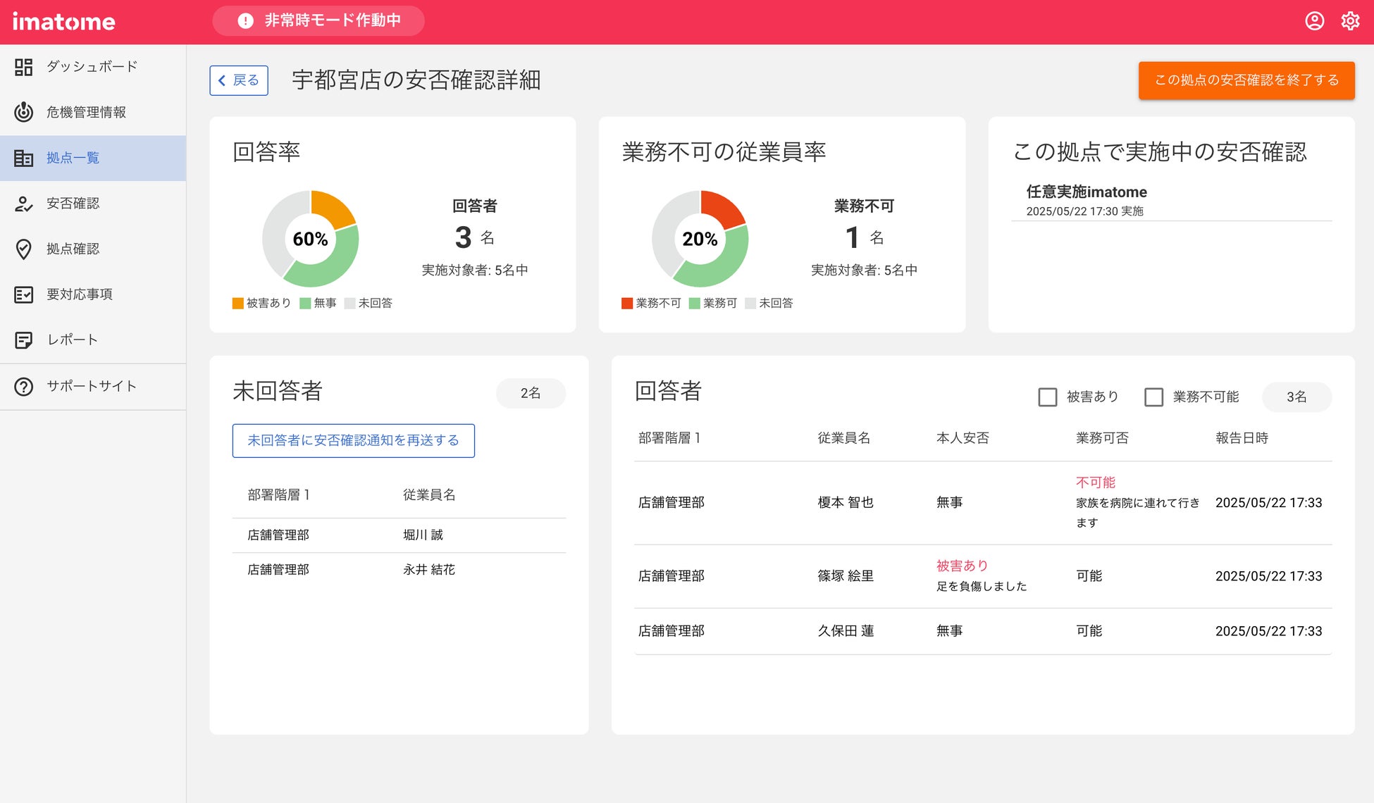 回答率や業務実施の可否などの統計データを拠点別・全体でそれぞれ表示可能に