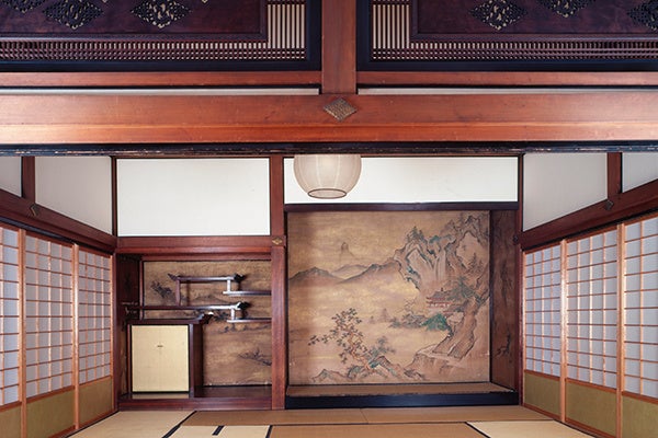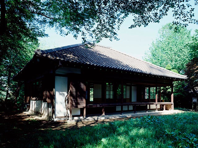 昭和9年(1934)九条道秀氏より寄贈され、東京赤坂の九条公爵邸から東京国立博物館の庭園に移築された日本家屋。床張付等には狩野派による著色山水図が描かれており、これらは、もと京都御所内の九条邸にあったものです。欄間には花梨の一枚板に藤花菱が透彫されています。有料の貸出施設であり、予約がなかなか取れないプレミアムな施設です。