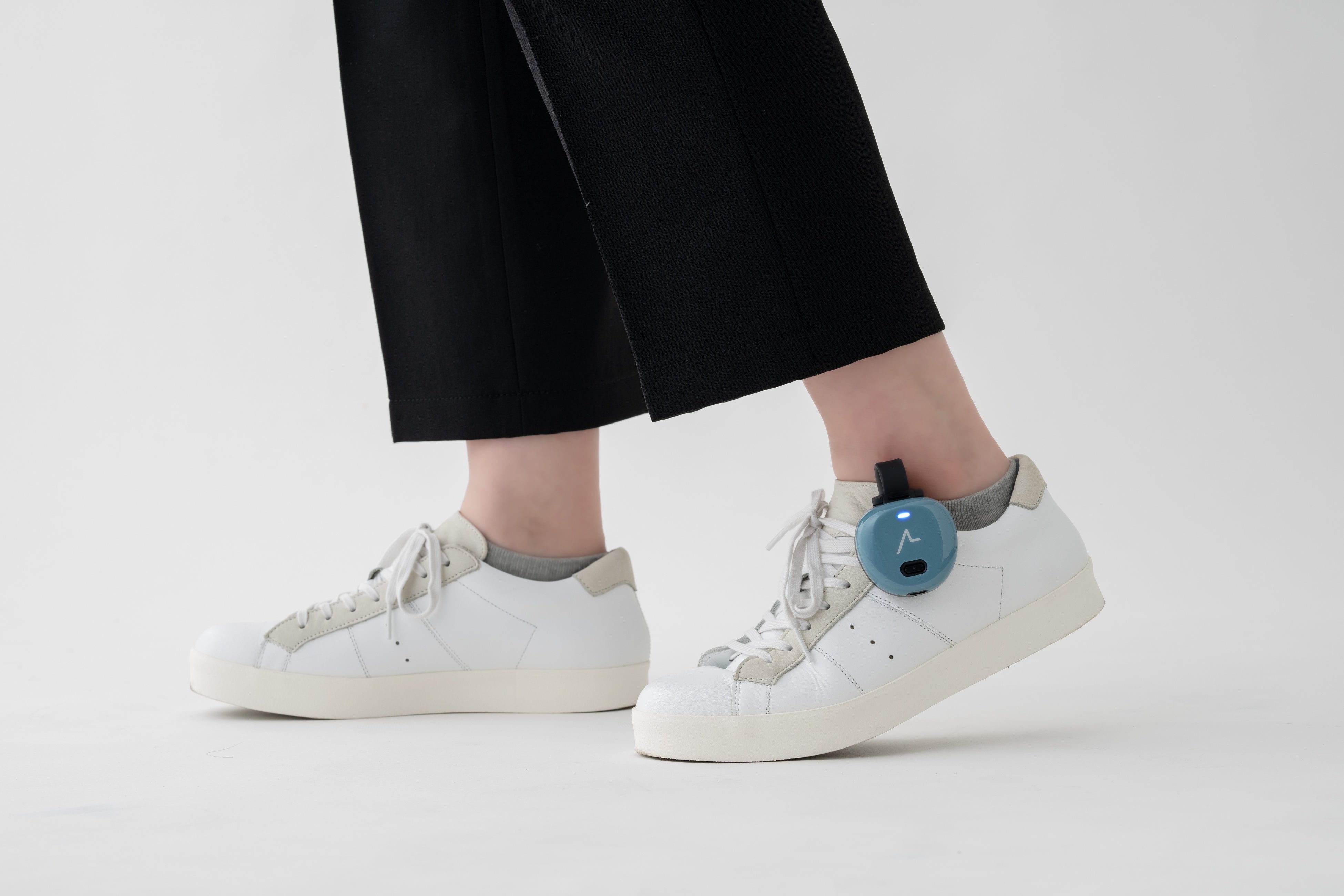 靴に装着したデバイスから足元への振動によって進行方向や曲がるタイミングを伝え、直感的な移動を可能にする視覚障害者向けのナビゲーションデバイスです。スマートフォンをポケットに入れたままで利用でき、白杖操作や周囲の音による安全確認を妨げない移動をサポートします。