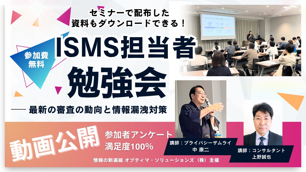 オプティマ・ソリューションズ株式会社(本社:東京都港区、代表:中康二)は、2025年9月3日(水)に新橋にて「ISMS担当者勉強会~最新の審査の動向と情報漏洩対策~」を開催いたしました。今回はその勉強会の動画を公開いたします。