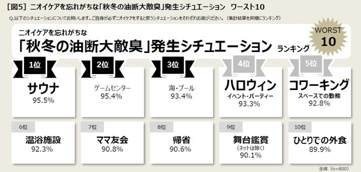 1位はビジネスパーソンに人気の整うスポット「サウナ」(95.5%)、4位にはそろそろ復活しそうなイベント「ハロウィンイベント・パーティー」(93.3%)、5位にはコロナ禍以降として新しいワークスタイル「コワーキングスペースでの勤務」(92.8%)と、注目シチュエーションがニオイケアを忘れがちなシチュエーションの上位に選ばれました。気持ちよく汗をかいた後のニオイケアをうっかりしがちなサウナ、ニオイケアも忘れるぐらい楽しいハロウィンなどのイベント、ひとりワークだからニオイケアに手を抜きがちなコワーキングなど、つい油断してしまう理由はさまざま考えられますが、ニオイケアも忘れずに秋冬のレジャーやイベントを楽しみたいですね。