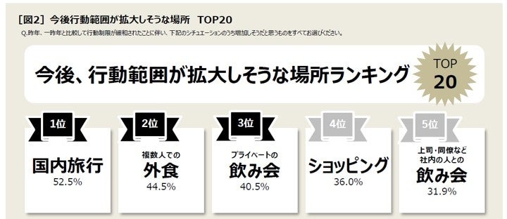 今後、行動範囲が拡大しそうなシチュエーションTOP3は「国内旅行」「複数人での外食」「飲み会」