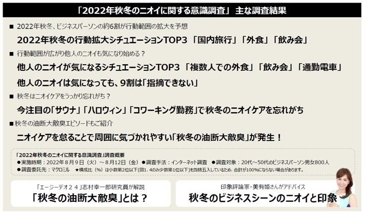 調査では、他人のニオイが気になるシチュエーションランキングで会食やビジネスシーンの場が多数ランクインしたほか、他人のニオイが気になっても9割の人が指摘できないことなどが明らかになりました。また、ニオイケアを怠りがちな秋冬は、「秋冬の油断大敵臭」が発生しやすくなりますが、「秋冬の油断大敵臭」が発生しやすいシチュエーションとして、「サウナ」「ハロウィンイベント」「コワーキングスペース」などがランクインしました。