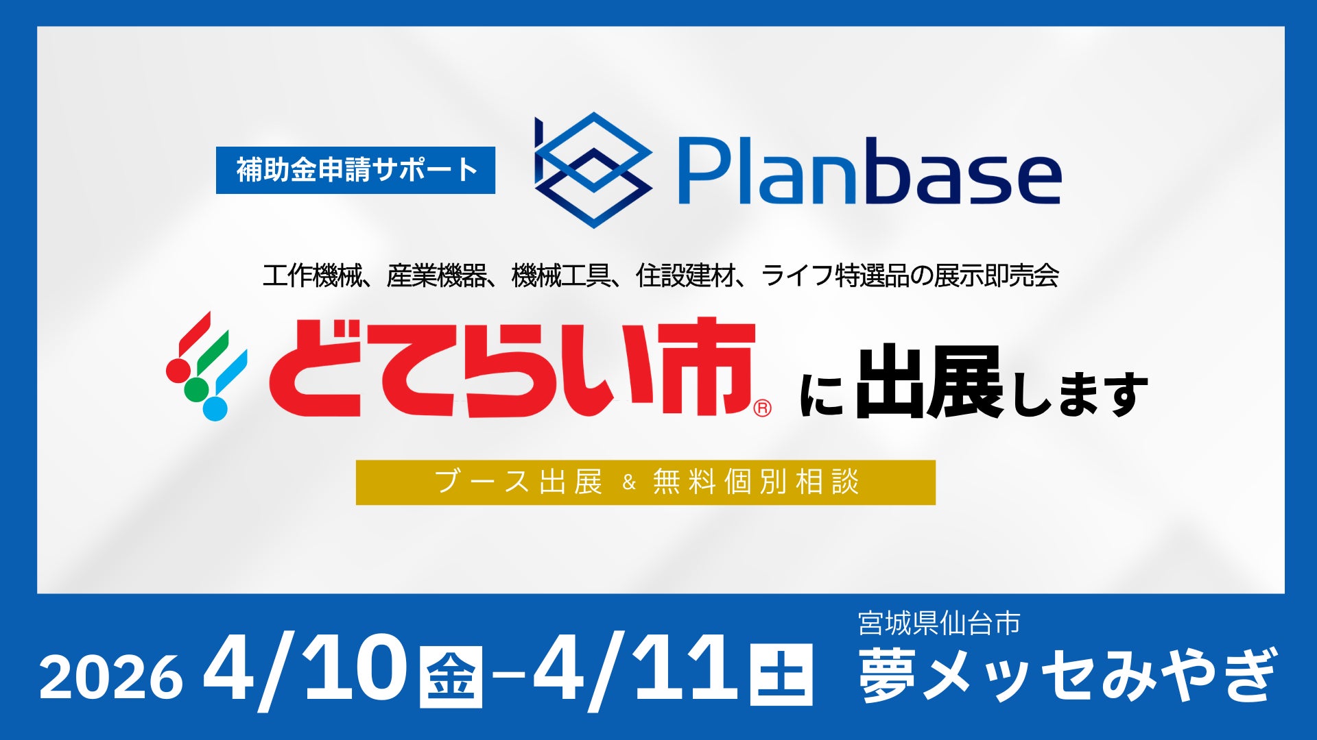 補助金申請支援や経営支援を行うコンサルティング企業の株式会社プランベース(本社:東京都千代田区、代表取締役:武衣 貴志)は、2026年4月10日(金)、4月11日(土)の両日、株式会社山善が事務局を務める工作機械等の展示即売会「2026東北どてらい市」に出展します。「どてらい市」は、工作機械・産業機器・工具などを中心に、全国各地で開催されてきた展示即売会で、2025年に誕生50年を迎えました。長年にわたり製造業をはじめとする多くの企業の設備投資を支えてきた歴史ある展示会として、毎年多くの来場者が訪れています。