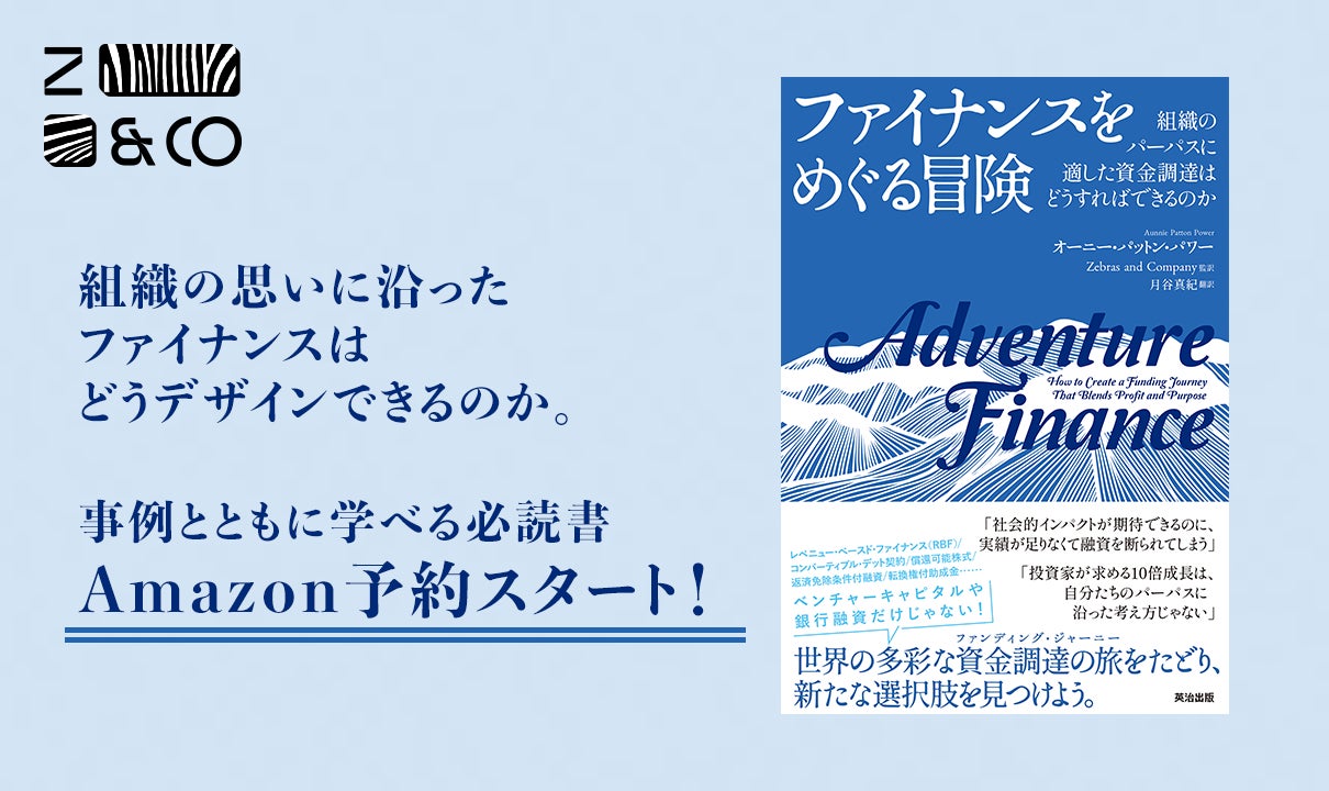 株式会社Zebras and Company(ヨミ:ゼブラ アンド カンパニー、本社:東京都港区麻布十番、代表取締役:阿座上陽平、田淵良敬、以下Z&C)が監訳として関わる、ゼブラ経営者に向けたファイナンスに関するビジネス書籍『ファイナンスをめぐる冒険~組織のパーパスに適した資金調達はどうすればできるのか~』の、Amazon事前予約がスタートいたしました。