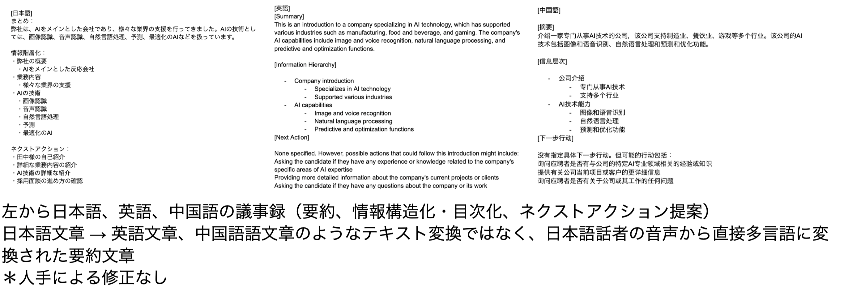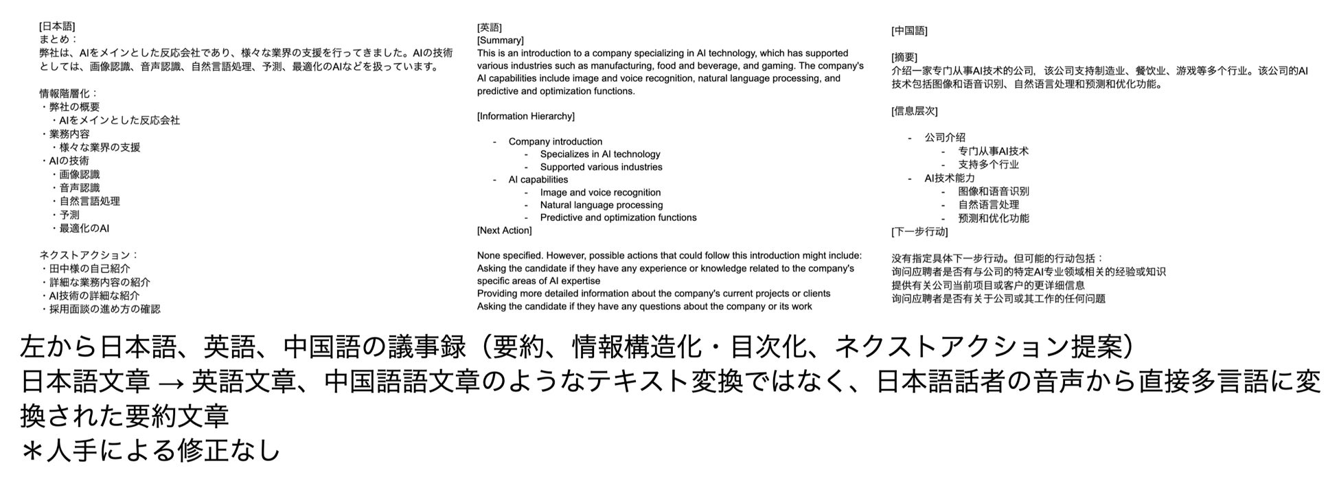 - 多言語に対応した高度なAI技術による精度の高い要約・構造化・提案