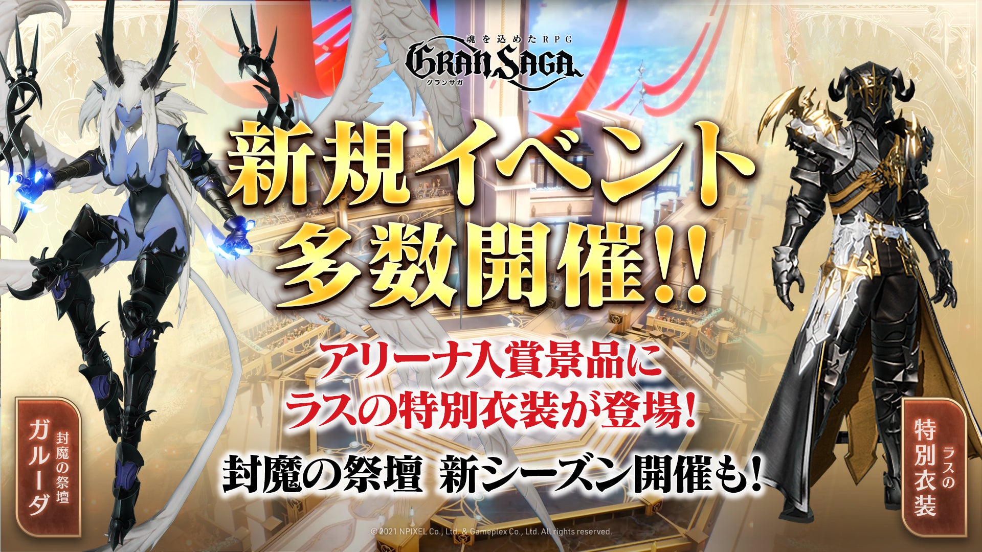 株式会社NPIXELは、クロスプラットフォーム対応の新作RPG『 グランサガ(Gran Saga)(運営:株式会社GAMEPLEX)にて、PVPコンテンツ『アリーナ』での上位入賞で主人公ラスの限定衣装『戦場の支配者』が貰える、期間限定イベントを本日より開催いたします!また、12月28日より『封魔の祭壇』新シーズンの開催を予定。その他にも、ギルド関連イベントなど、多数のベントを開催予定です!