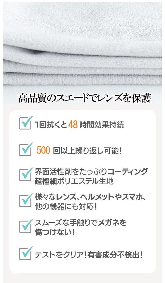 1回サッと拭くだけで48時間以上メガネが曇りません。500回以上繰り返し可能です。メガネ用、車用タイプが選べます。どちらも1回拭くだけで曇り防止に !
