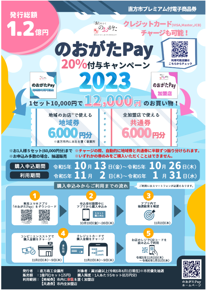 「のおがたPay20%付与キャンペーン2023」は原油価格・物価高騰による影響を受けた地域内消費を喚起し、地域経済の活性化を図る事業で、1セット10,000円で購入後、20%のプレミアムが付与され、全加盟店で使える共通券6,000円分と地域のお店で使える地域券6,000円分に自動的に半額ずつ振り分けられる電子商品券です。