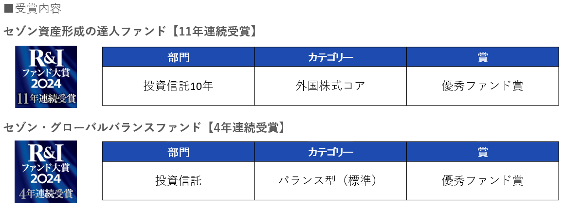 セゾン資産形成の達人ファンドは外国株式カテゴリーの投資信託としては最長の11年連続受賞となります。2ファンドともに第三者の評価機関から運用実績のみで毎年評価いただけることは、一貫した運用方針・哲学で、長期資産形成に適したファンドを運用してきた結果だと思っております。またつみたて投資を中心に当社ファンドに投資をしてくださっている多くのお客さまのおかげでもあります。