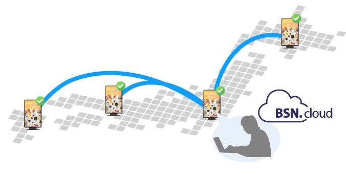 『BSN.cloud(ビー・エス・エヌ・クラウド)』 は「BrightSignシリーズ5」に対応したオプションの最新クラウドサービスです。BrightSignによるサイネージをどこからでも包括的に管理できます。リモートDWS機能搭載により、プレーヤーの状態監視や設定確認、動画再生ログの取得も可能です。初期費用は不要で、安価で安全に運用できます。