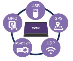 RS-232C、USB、GPIO、UDPで外部機器と接続し、双方向のコントロールが可能です。オプションのセンサーを併用することで、プログラム開発をすることなくインタラクティブサイネージを簡単に実現できます。各種の設定は、「BrightAuthor:connected」にて直感的な操作で行えます。