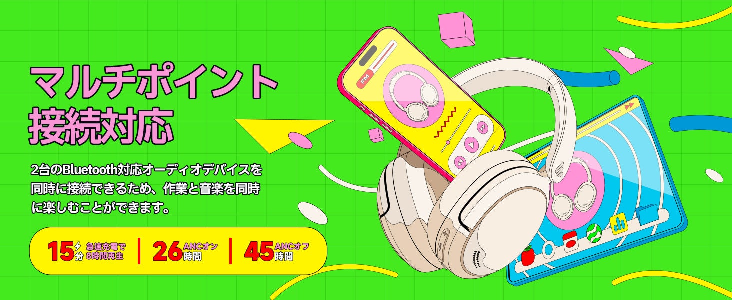 大容量バッテリーと低消費電力チップを搭載し、ANCオフ時には最大45時間の音楽再生が可能です。