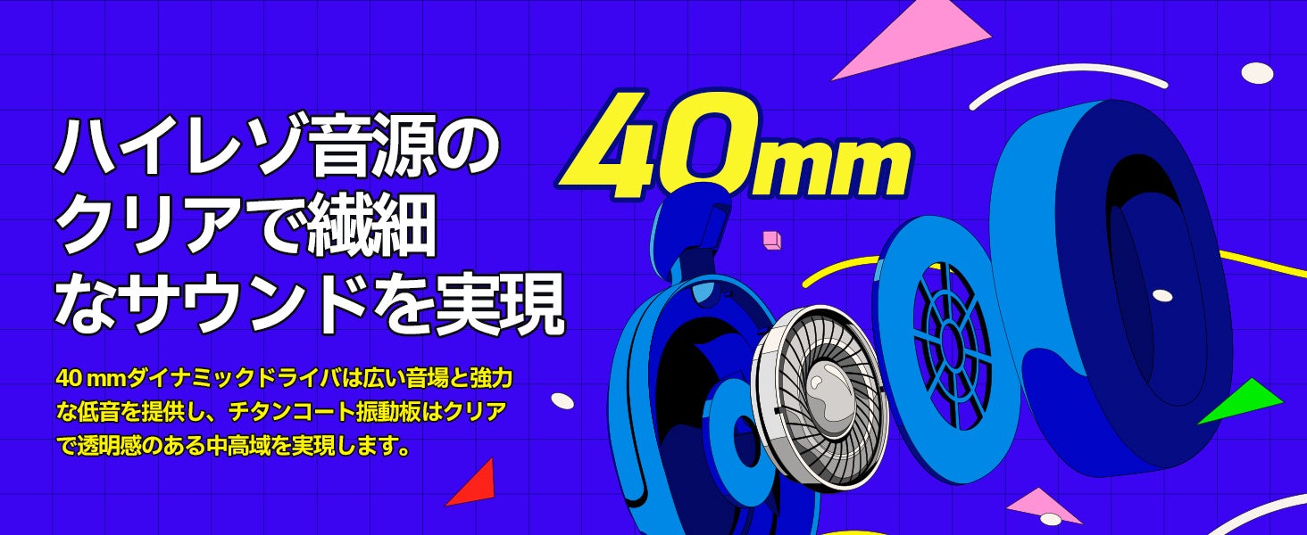 40mmダイナミックドライバとチタンコート振動板を搭載し、深みのある低音から透明感のある中高域まで、幅広い音域を再現。有線接続時にはハイレゾ音源にも対応しています。