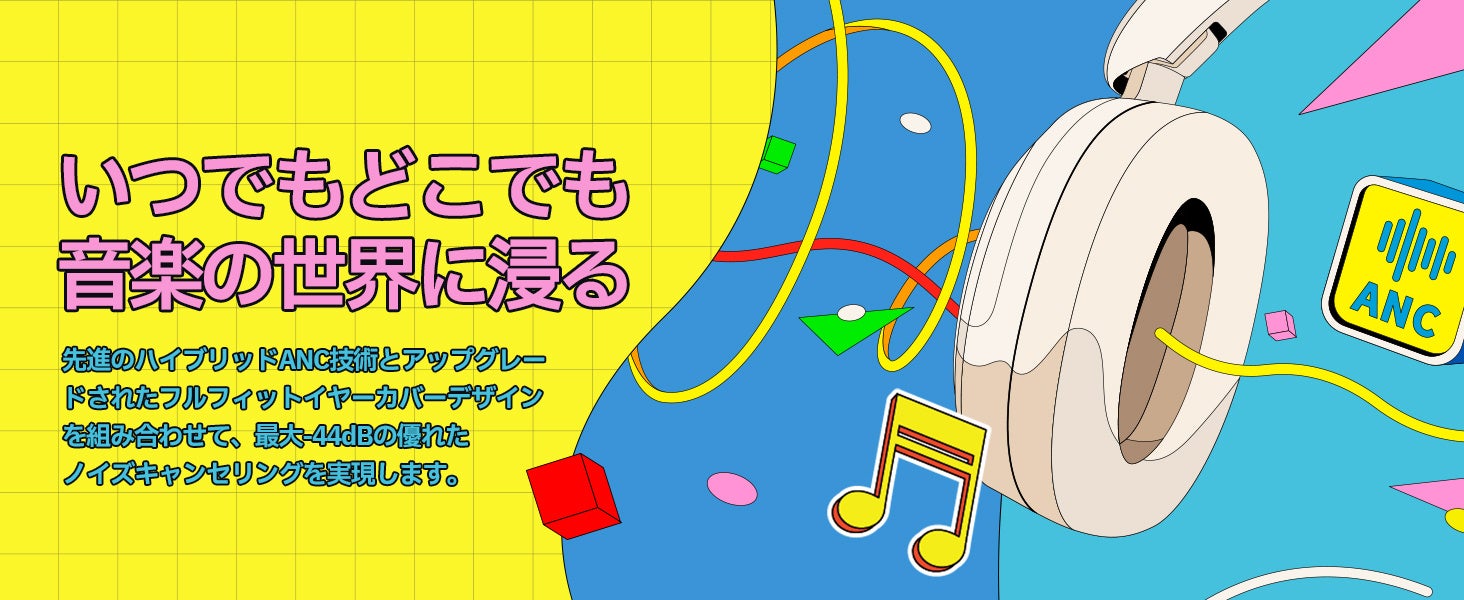 先進のアクティブノイズキャンセリング技術 最大-44dBのハイブリッド・アクティブ・ノイズキャンセリング機能により、周囲の騒音を効果的に低減。騒がしい環境でもクリアな音質を提供します。