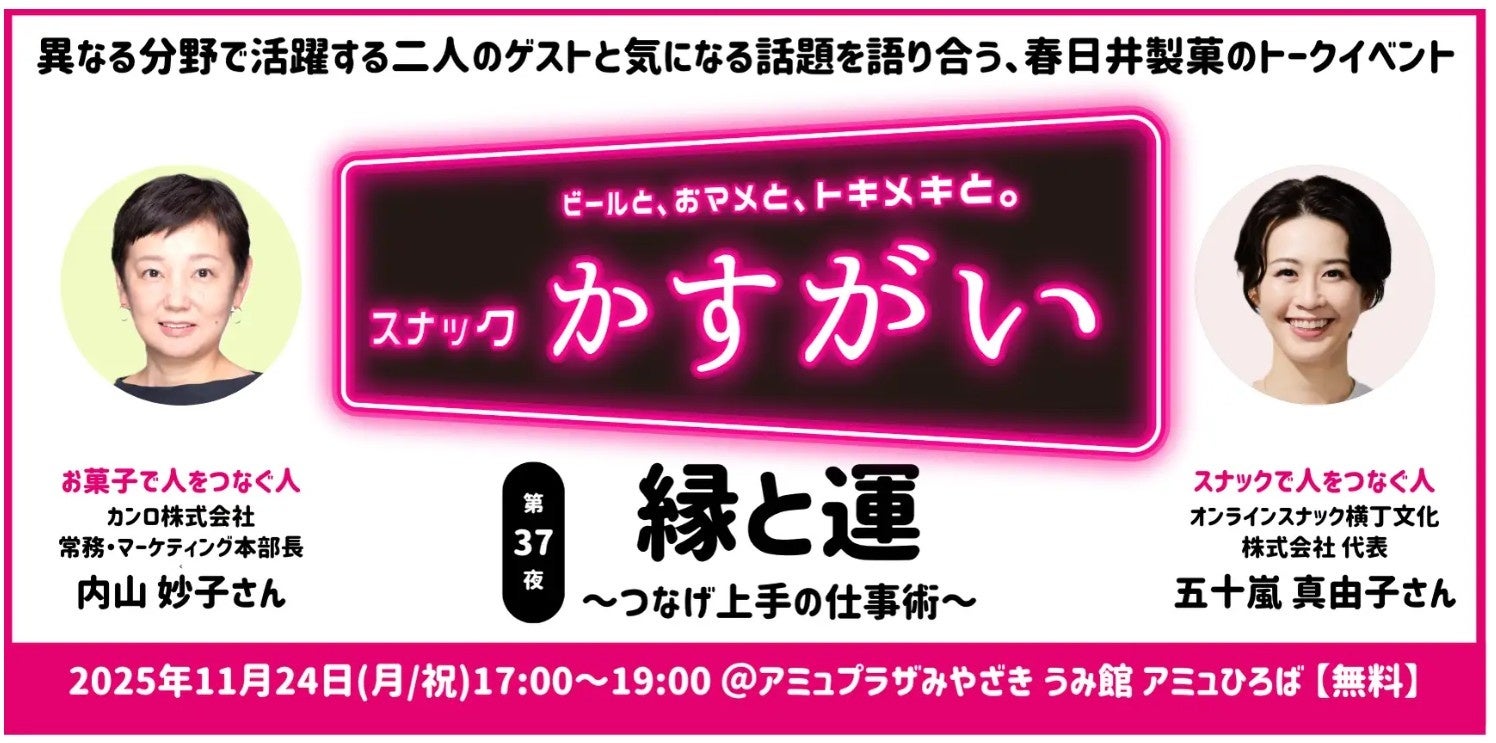 カンロ株式会社 常務執行役員・内山妙子氏、春日井製菓 原智彦氏、スナック横丁 代表・五十嵐真由子が登壇。「飴とスナックの“縁と運”」をテーマに、台本なしの白熱トークを展開します。 人と人をつなぐ「かすがい」の役割を果たすお菓子とスナック。参加者同士の交流タイムもあり、スナックならではの温かい「つながる空気感」を体感できます。