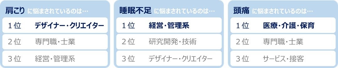 また「頭痛」悩みの上位には人と接する職業が並ぶなど、ランキングからは、職種が違っても似たようなワークスタイルで働く方たちの間では、同じ健康悩みが生まれやすいことが見て取れます。