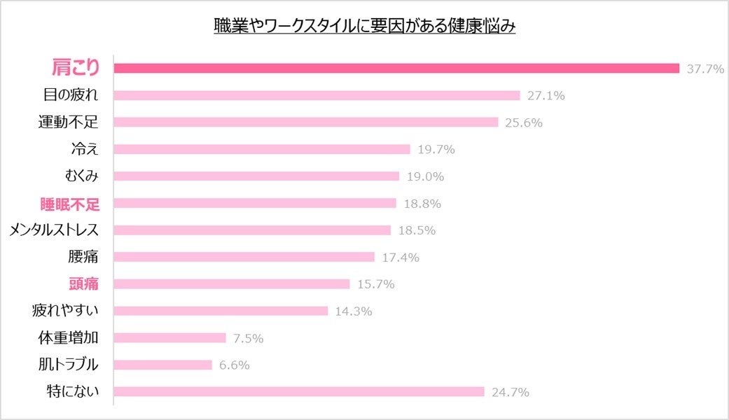 - 仕事起因の健康悩み1位は「肩こり」。似たワークスタイルから同じ健康悩みが生まれる傾向。