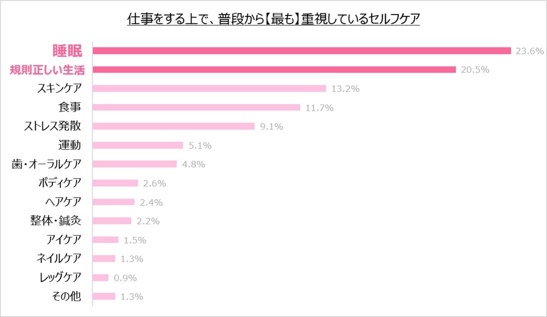 - 働くために重視するセルフケアは「睡眠」と「規則正しい生活」