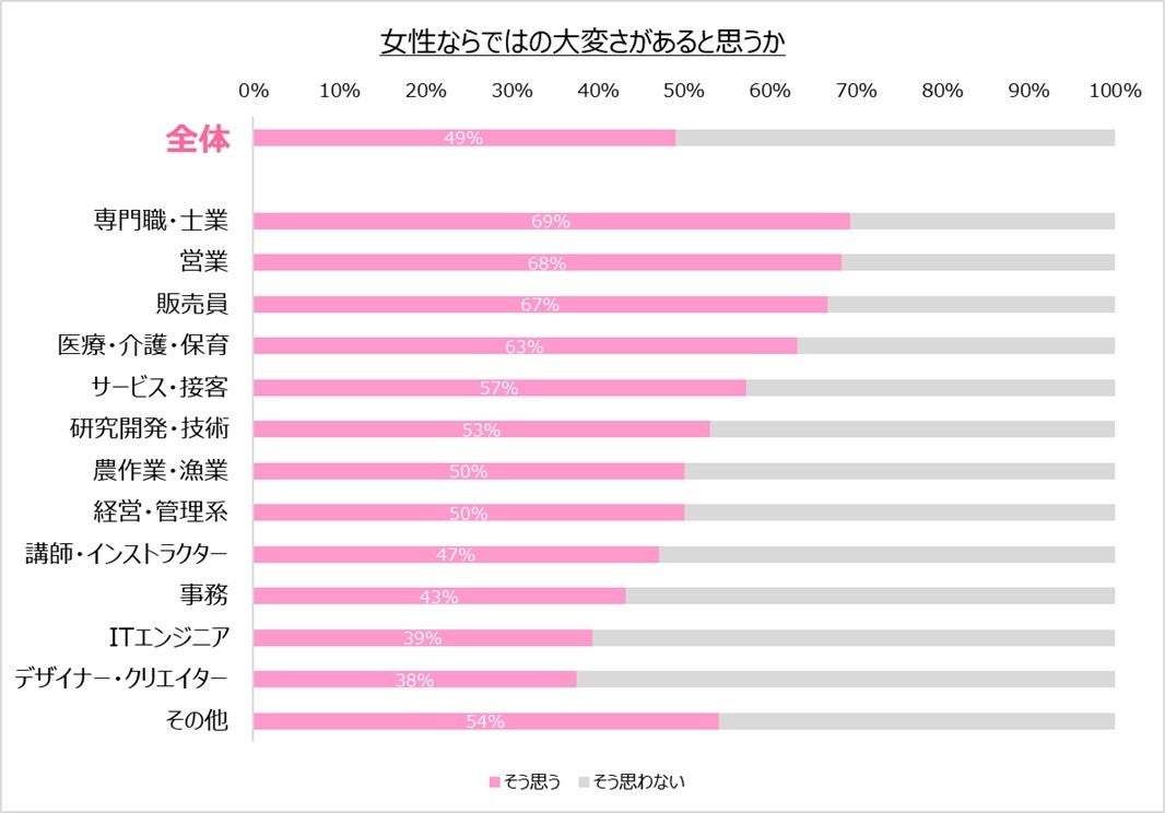- 仕事に女性ならではの大変さを感じる人は全体の49%。特に人と接する仕事に多い。
