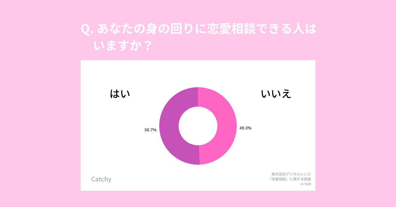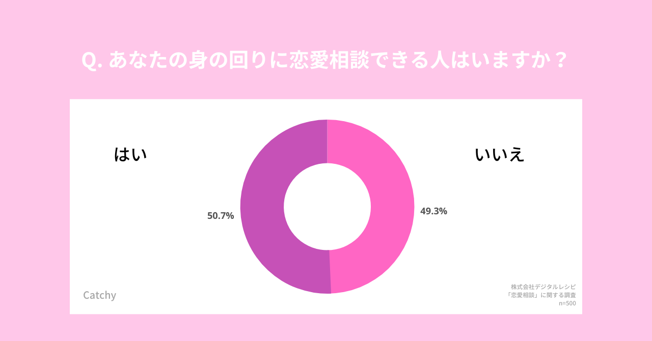 「あなたの身の回りに恋愛相談できる人はいますか?」(n=500)と質問したところ、「はい」(50.7%)、「いいえ」(49.3%)と回答しました