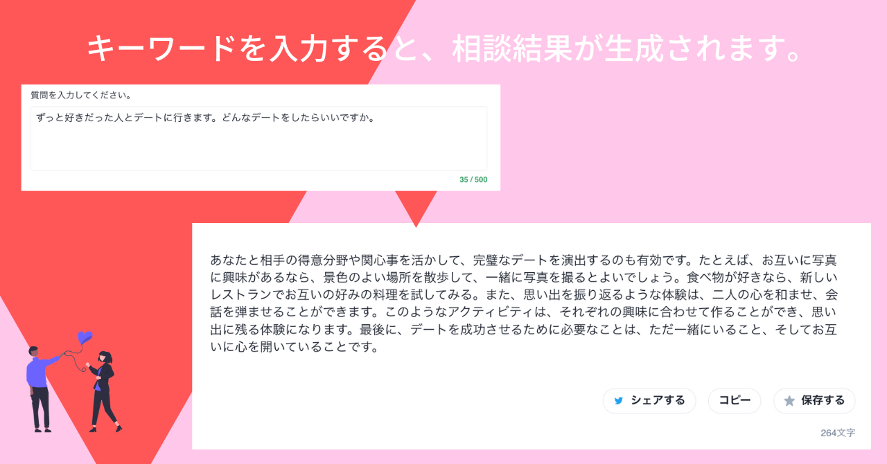 その結果を受け、バレンタインを来月に控える今、文章生成AI「Catchy」では意中の相手や恋人とのコミュニケーションをサポートする「AI 恋愛相談箱」をリリースしました。