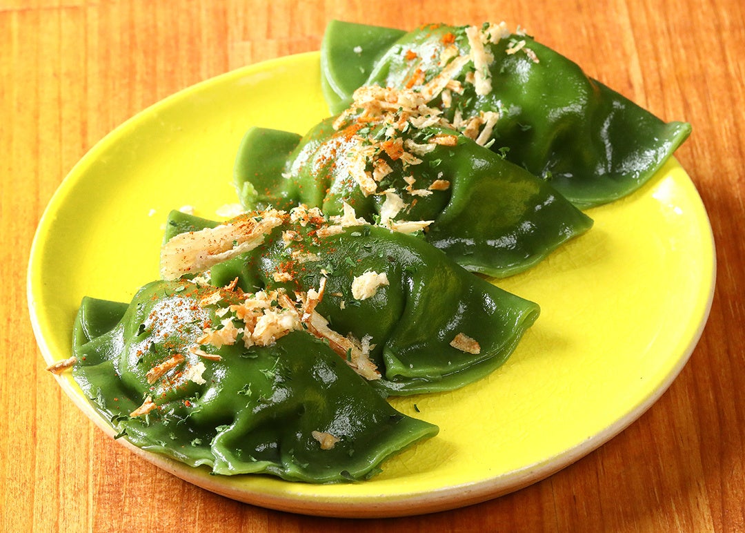 串刺しされた餃子を引っ提げて堂々初参戦する【餃子屋ヒロ】の「ヒロの串餃子 4種旨ダレ食べくらべ」。和風だしとニンニク味を効かせた野菜たっぷりのあっさり餡に合わせた4種類のタレは、自家製食べるラー油のせに、濃厚チーズとのコラボ。更にクセになる明太子ダレと甘ピリ辛が効いた胡麻味噌ダレ。最後のひと粒は何もつけないノーマルで召し上がれ。 餃子の皮をパスタに見立てて完成させた創作イタリアン餃子「The餃子アラビアータ!」は、唐辛子とトマトで色付けた皮に特製餡を詰め込んだ焼き餃子は、オリジナリティあふれる創作点心がコンセプトの【ワインと点心TUITUI】から。もうひとつの人気メニュー、皮から餡までほうれん草づくしの「ほうれん草のスパイシー餃子」は、ターメリックなどのスパイスと絡めたインド風水餃子は魅惑の味。