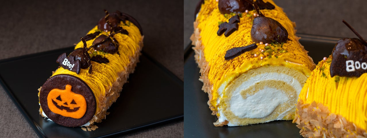 ふわふわのスフレ生地にメープル風味のクリームを包んだロールケーキを、かぼちゃのクリームとチョコレートでデコレーション。ハロウィーンのモチーフを詰め込んだコワ可愛いケーキに仕上がっています。