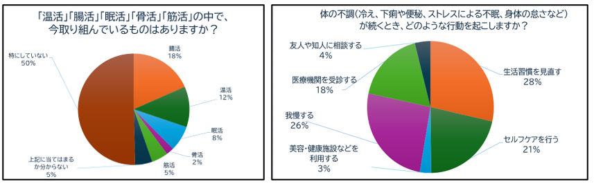 今回の調査では、『温活』『腸活』『眠活』『骨活』『筋活』のうち、いま現在いずれかの『活』に取り組んでいる人の割合は全体の45%だったが、今取り組んではいないものの、5活に関わる体調不良の際に、サプリメント・健康食品、機器・グッズを活用した「セルフケア」をはじめとする改善行動に取り組むと回答した人の割合はそのうち約半数に上った。同様に取り組んでいないとの回答者のうち約3分の1が「あったらいいと思う商材」に回答を寄せるなど、今後の市場の拡がりを期待させる結果となった。
