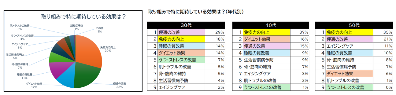 『温活』『腸活』『眠活』『骨活』『筋活』いずれかの『活』に取り組んでいると回答した人に5活に期待する効果について尋ねた。全体のトップは「免疫力の改善」で、その後に「便通の改善」、「ダイエット効果」が続く。さらに年代別に見たところ、30代では「うつ・ストレスの改善」(7%)、「睡眠の質改善」(14%)、「便通の改善」(29%)など、全体としていまの健康課題の改善につながる効果に期待する割合が高くなった。一方で、40代、50代では「免疫力の向上」が40代で37%、50代で35%と大きな割合を占めた他、「生活習慣病予防」、「骨・筋肉の維持」の割合も高くなり、年齢とともに未病対策への意識の高まりが伺える結果となった。