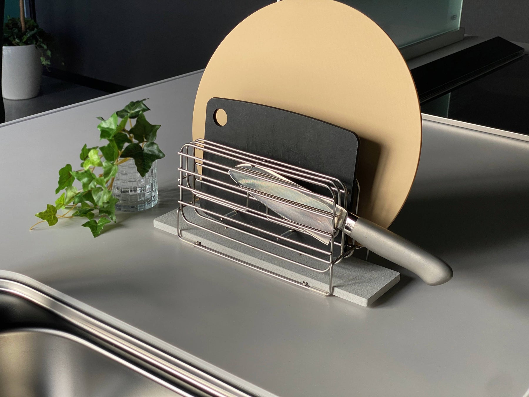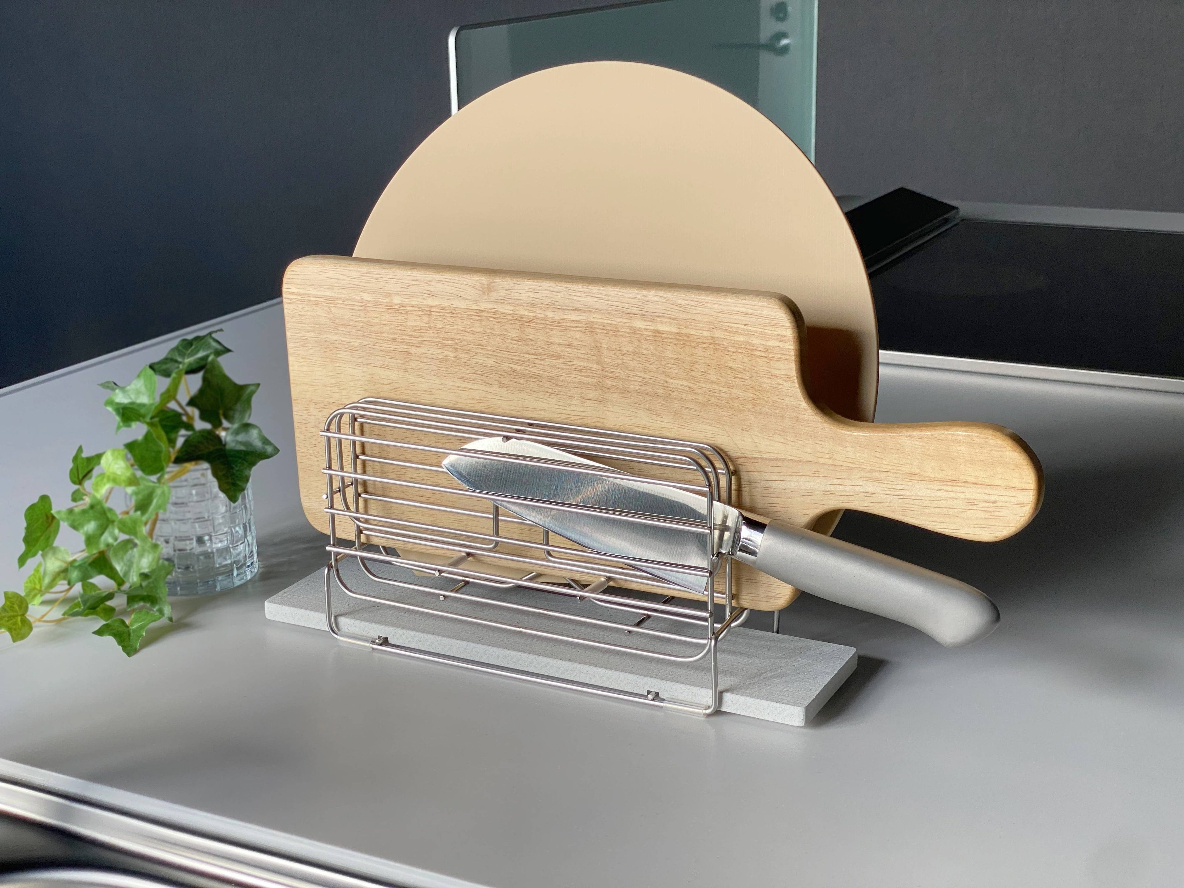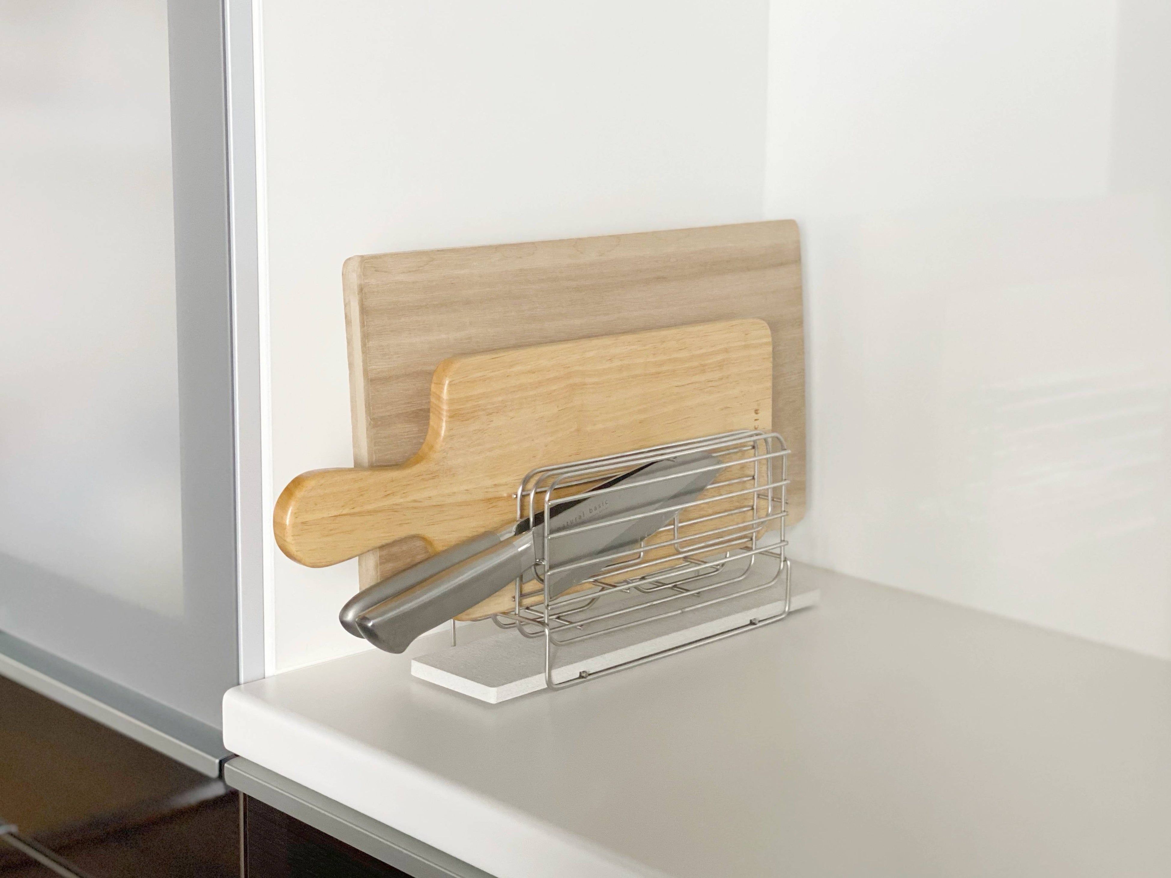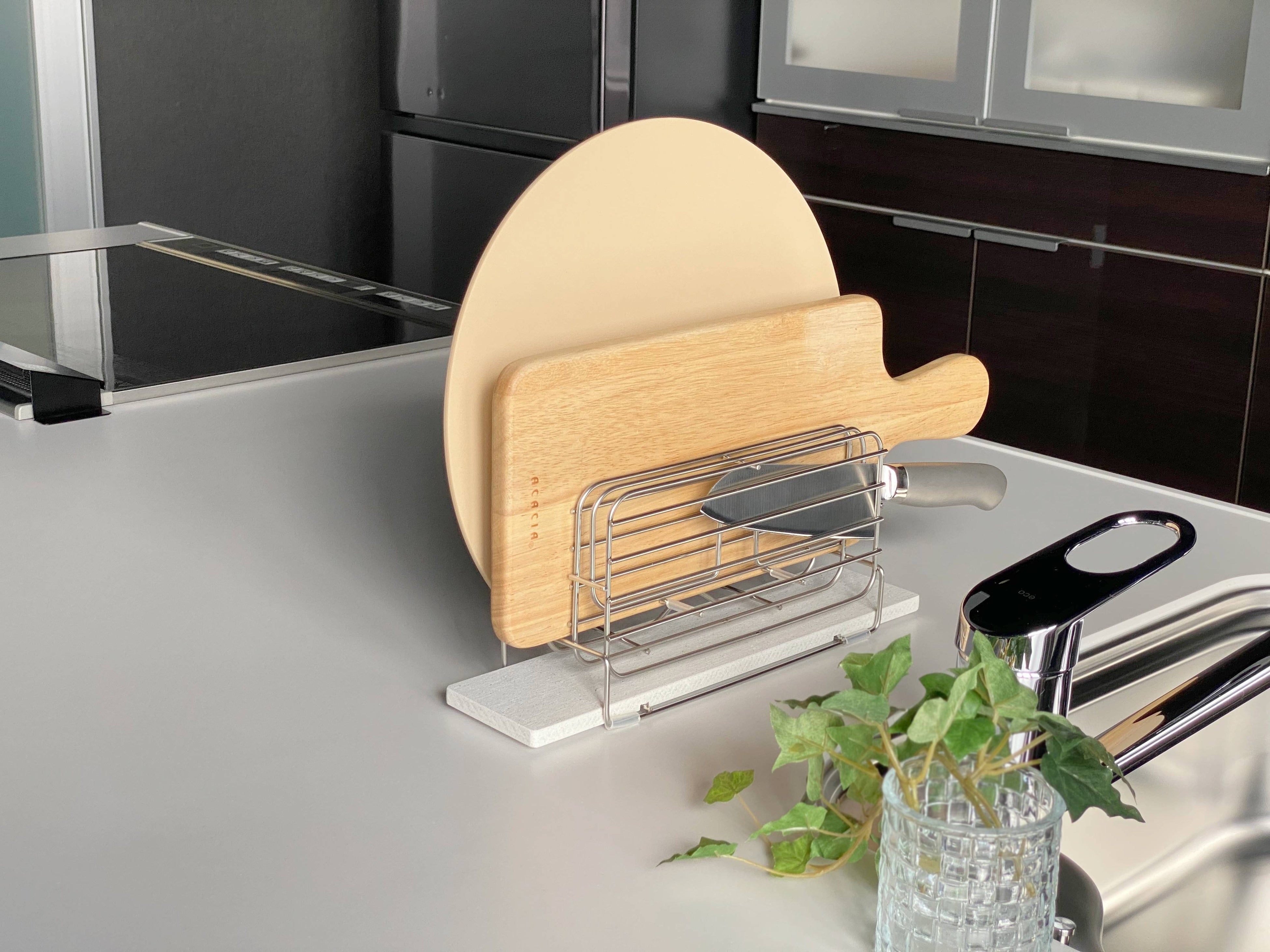 ここで問題になるのが、洗った後のまな板と包丁はちょっと置き場に困るということ。水切りかごの中ではまな板は場所を取るし、包丁は危ない。すぐに拭いて片付けることができれば一番良いですが、忙しい毎日ではなかなかそんな余裕もなかったり…。