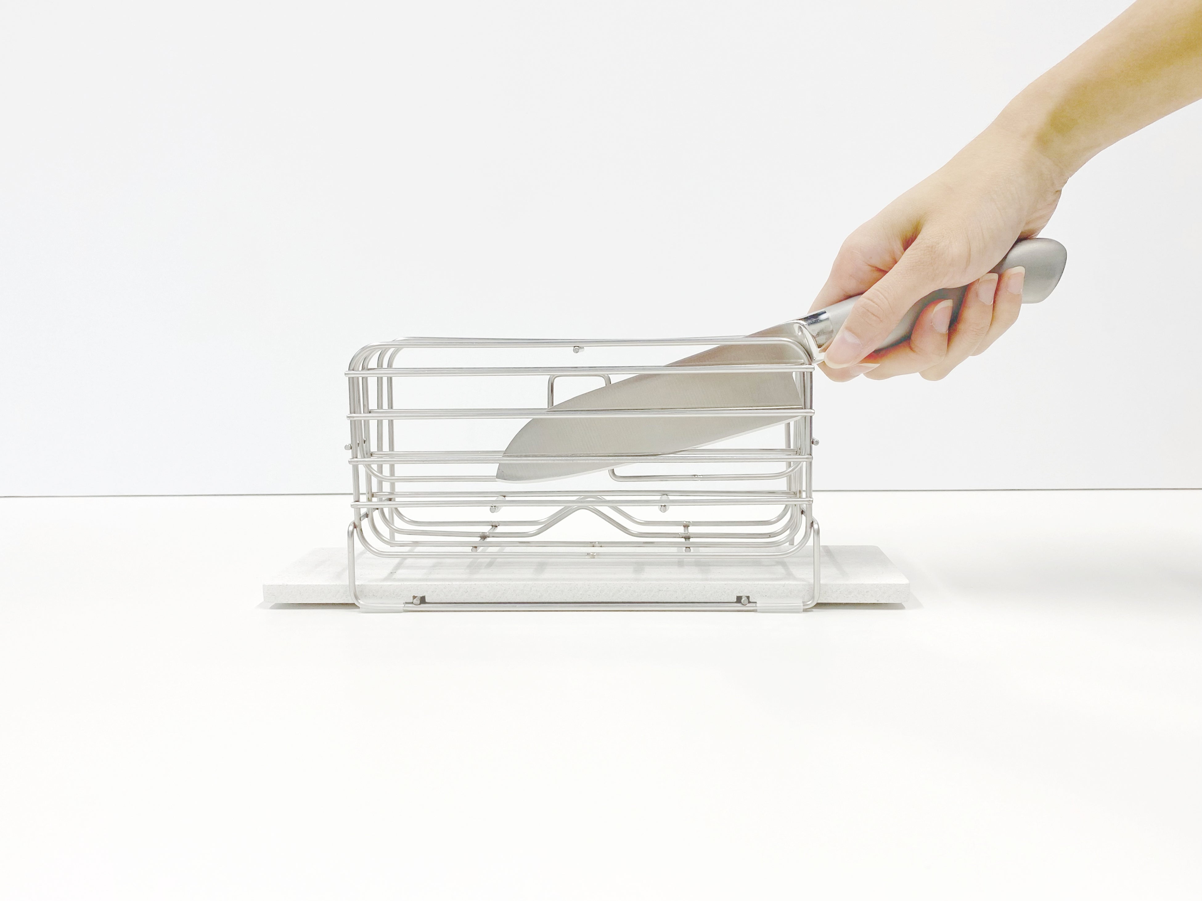 今回ご紹介する新商品は、洗ったまな板と包丁の水切りと収納をそのまま一体化して片付けの工程を省略できる優れもの。水受けは吸水素材を採用。洗った後の水滴はそのまま吸水&速乾するので水捨て不要。忙しい毎日の負担をほんの少し減らせるアイテムです。