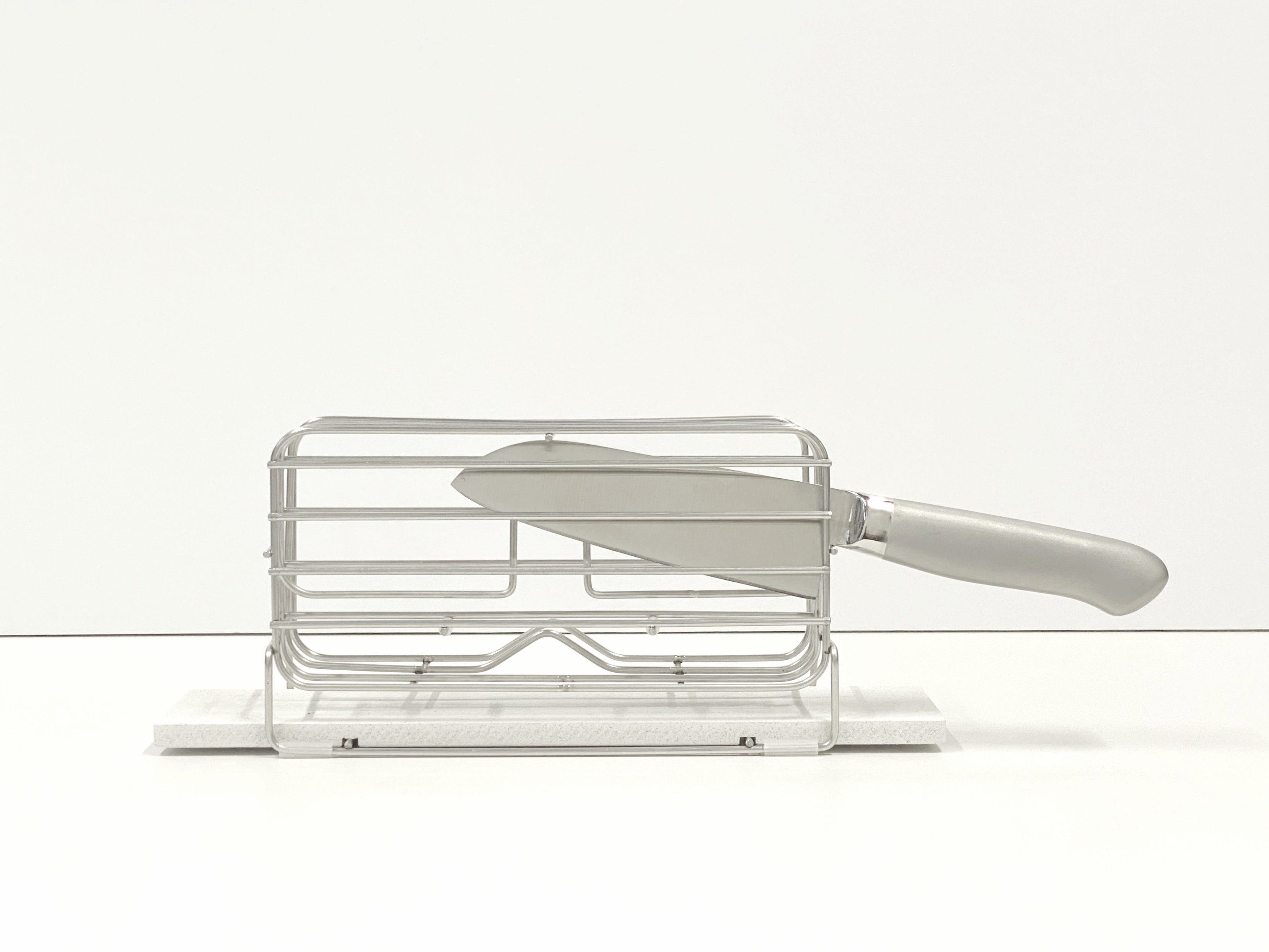 よく見かける包丁スタンドは縦に入れるものがほとんどですが、このまな板&包丁スタンドは、自社開発した横入れ構造を採用。包丁の刃を下にしたまま収納できるので安心です。