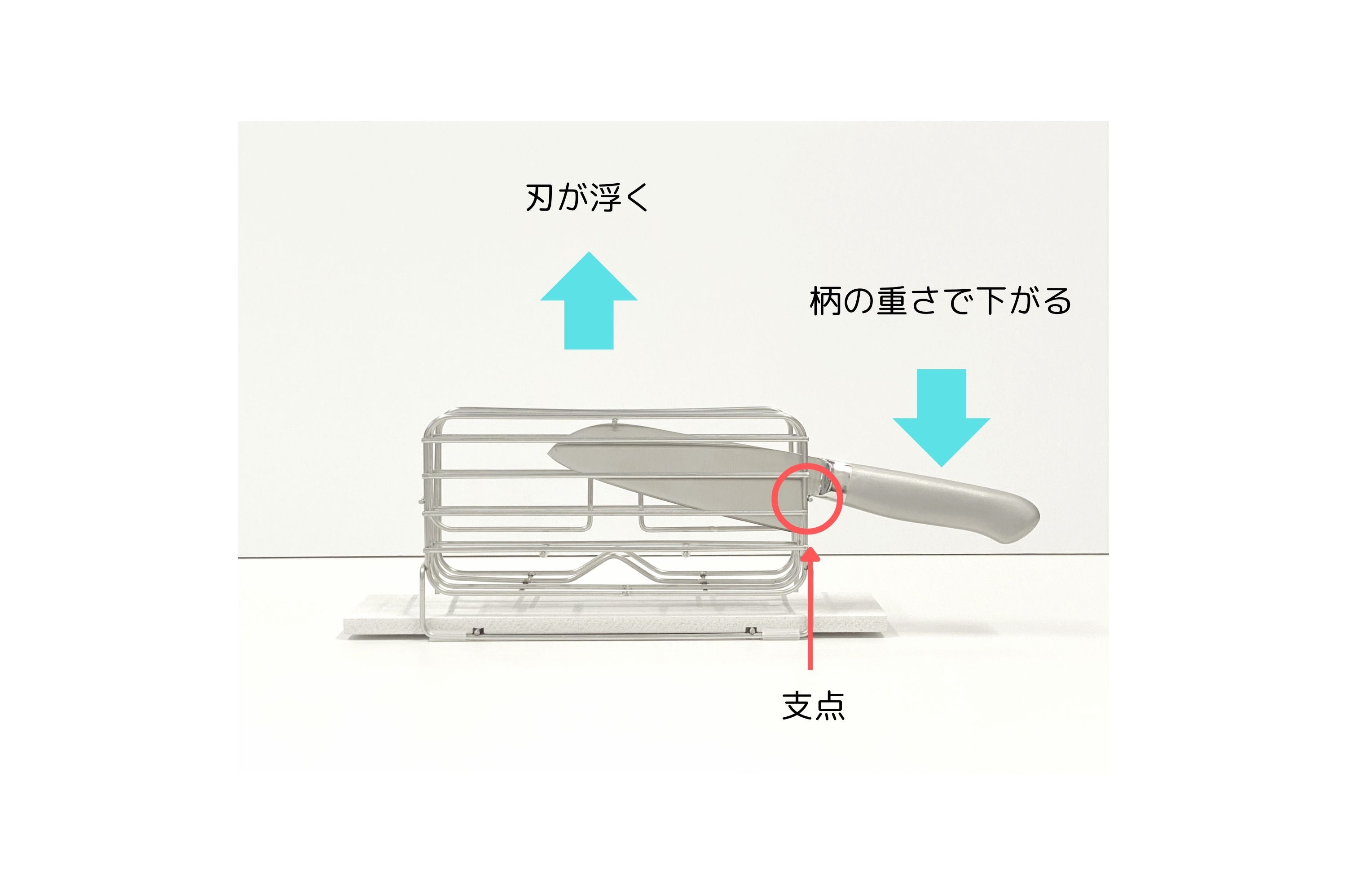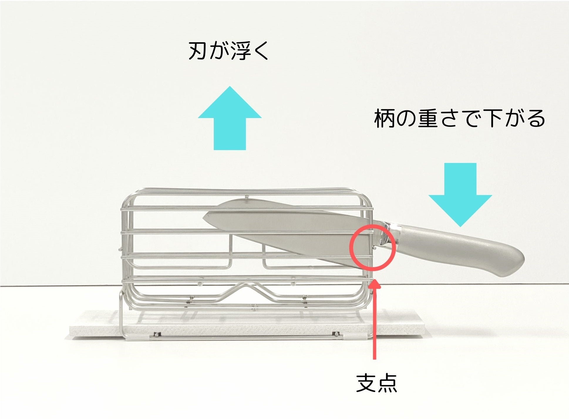 包丁の柄の重みを利用して、刃を浮かせる構造。