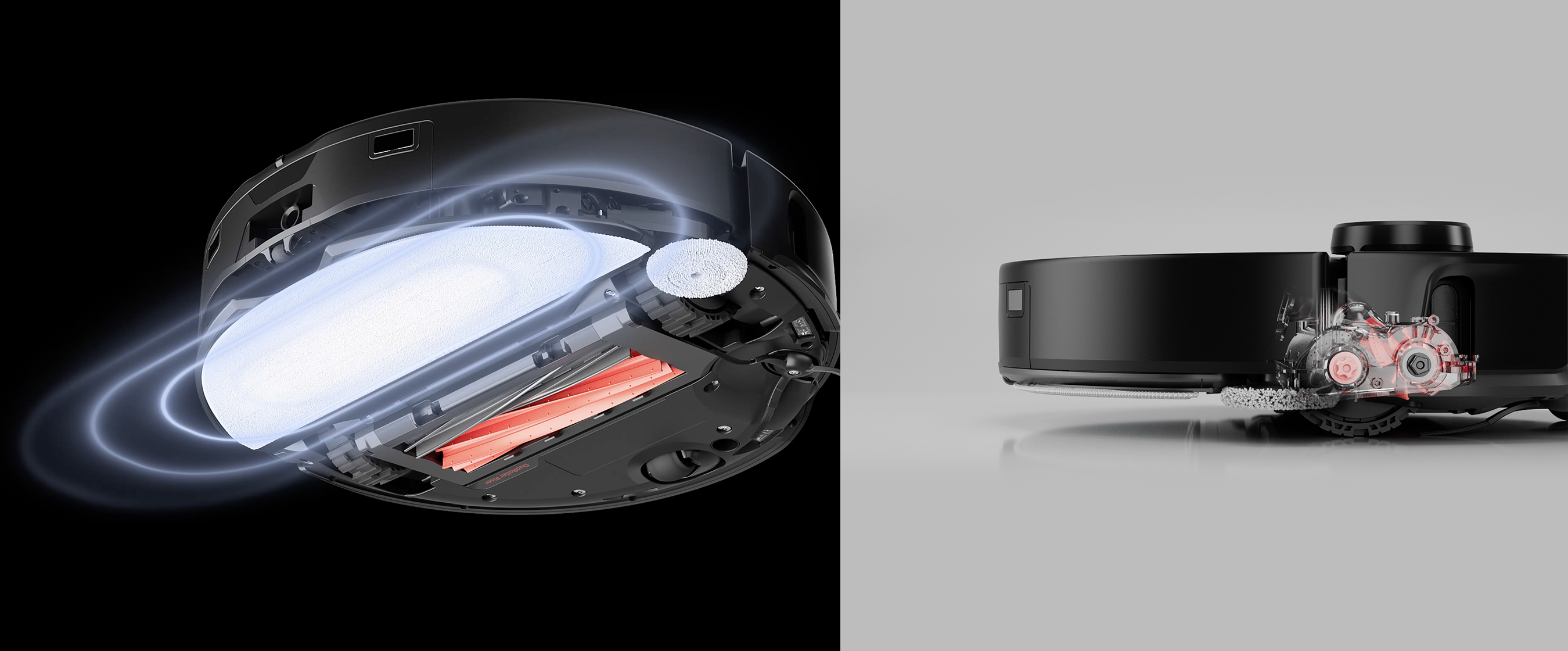 部屋の四隅を検知して自動で伸びる※¹※²サイドブラシを搭載し、今まで届きにくかった隅のゴミもしっかりかき出します。サイドブラシによる部屋の四隅のカバー率は100%※¹※²です。また、最大毎分185回転※³する壁キワ用モップも新たに搭載し、壁際の汚れまで水拭きします。