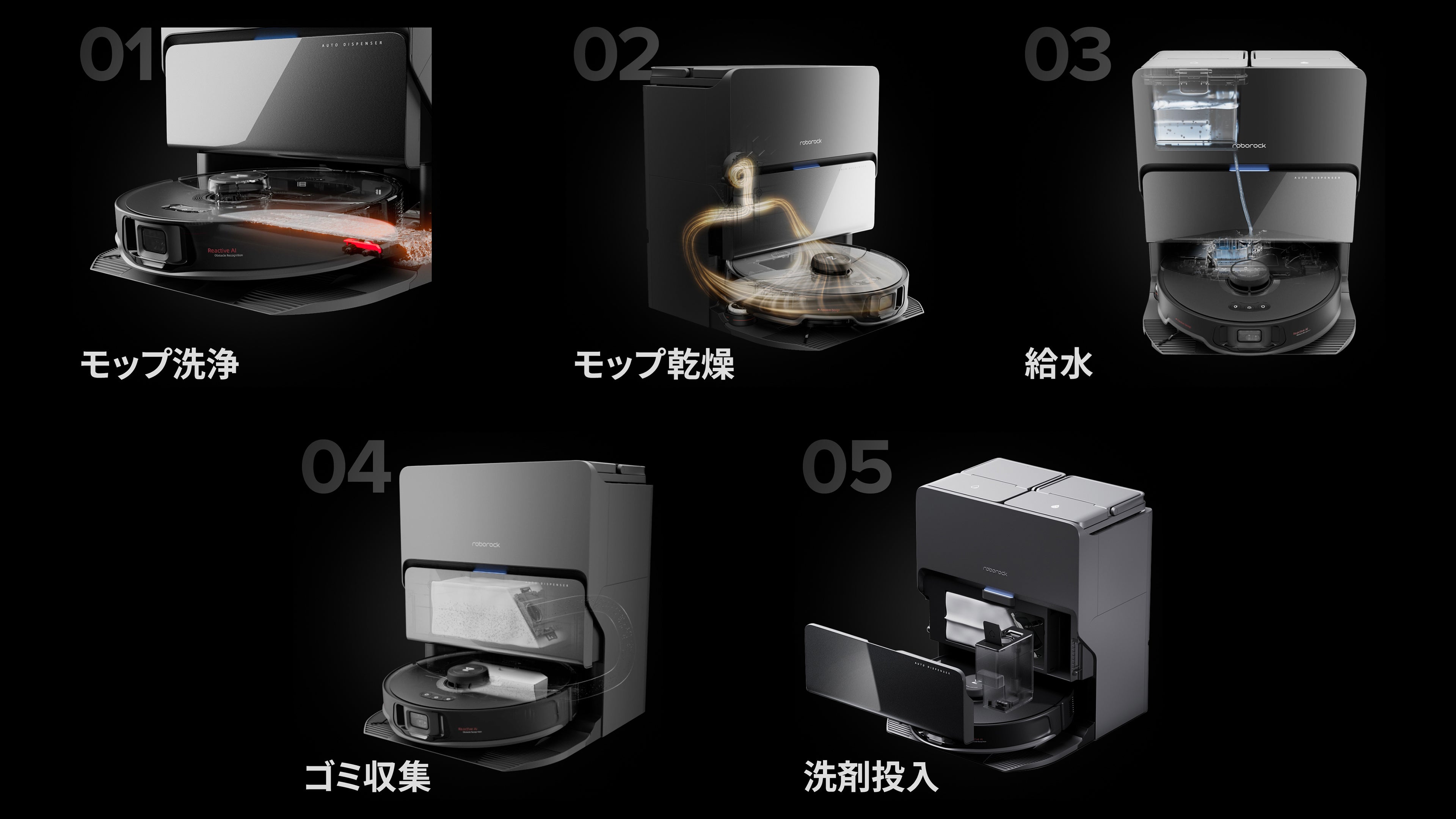 5way全自動ドック搭載で、モップ洗浄、乾燥、給水、ゴミ収集、洗剤投入を自動化