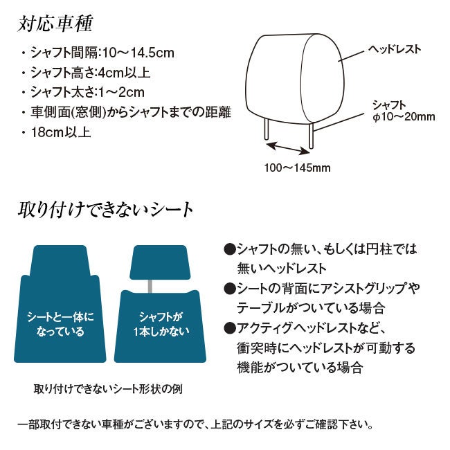 ヘッドレストシャフトに取付するので、車種を選ばず設置できます。