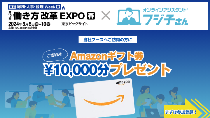 オンラインアシスタント「フジ子さん」、「第13回 働き方改革EXPO 春 -総務・人事・経理 Week-5月8日(水)~10日(金)開催」に出展