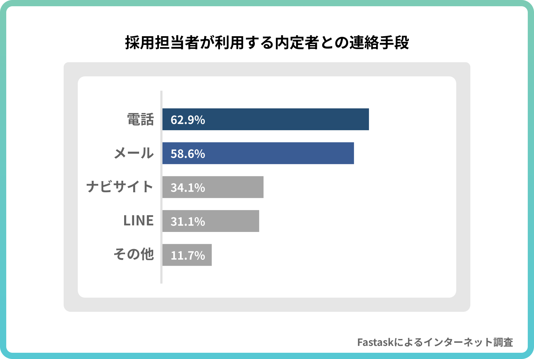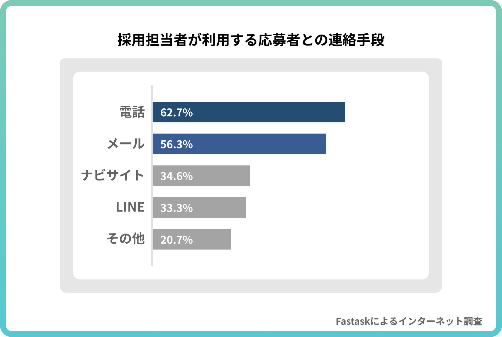 「電話」(62.9%)、「メール」(58.6%)が引き続き中心で、「LINE」は31.1%と、応募者対応時よりもわずかに低下しました。