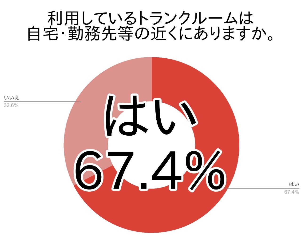 トランクルームの位置するエリアがわかったところで、アンケートでは次に「利用者の生活にとっての立地」に注目しました。具体的には、利用しているトランクルームが自宅や勤務先等の近くに位置しているかを尋ねました。