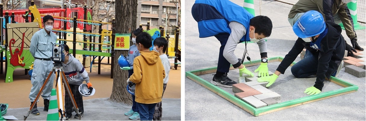当日は、ワークショップ参加者が事前に描いた絵を印刷したモニュメントのお披露目や測量・モルタル塗りなどの工事体験を行うほか、新しい遊具を体験しました。