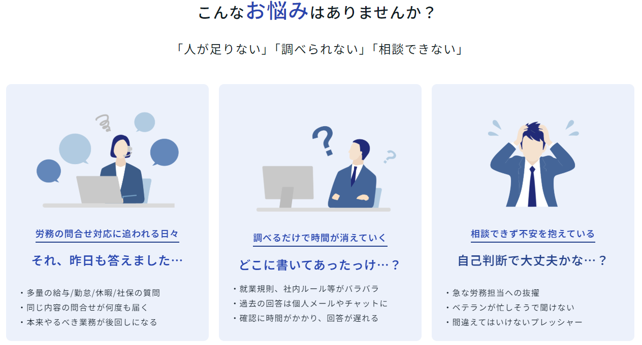 労働関連法令の改正が相次ぎ、企業に求められる労務管理の範囲が年々拡大するなか、労務部門の現場では、慢性的な人手不足、従業員からの問合せ増加、ベテラン担当者への業務集中といった課題が顕在化しています。