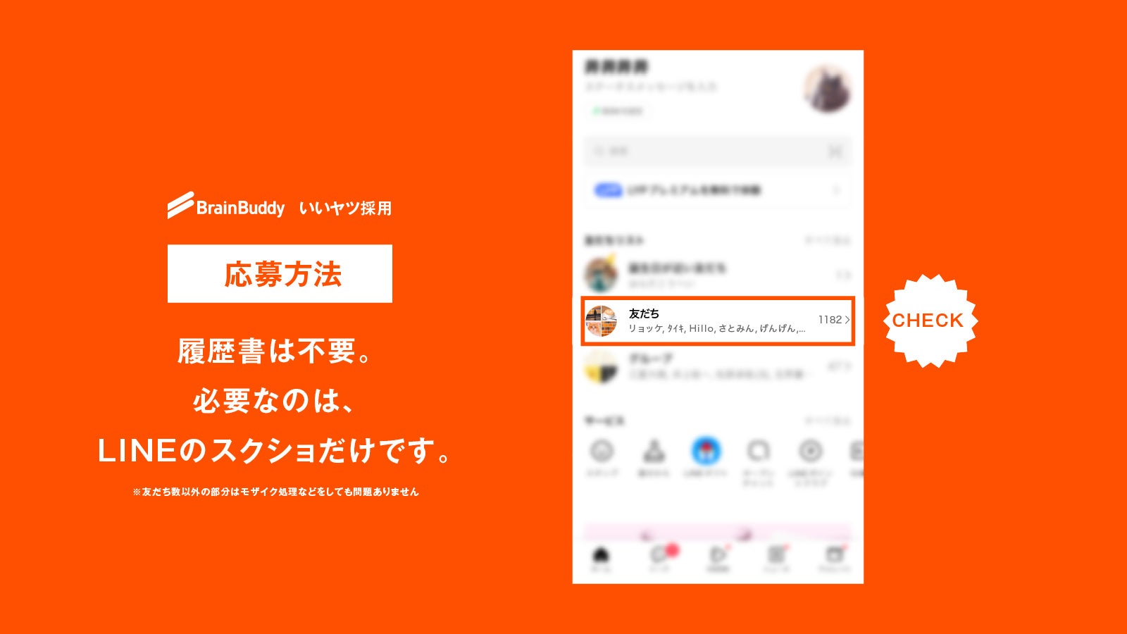 「いいヤツ」という才能を信じるブレーンバディでは、LINEの友だちの数だけで応募できる「いいヤツ採用」を実施します。