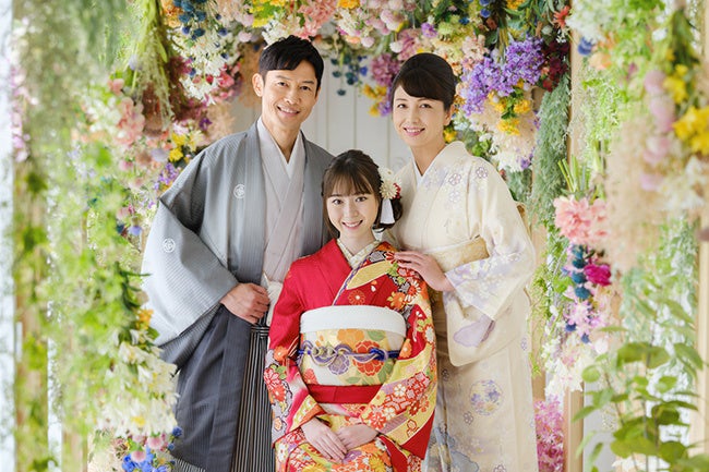 特別な日だからこそ、成人を迎える主役だけでなく、パパ・ママも一緒に着物で撮影できるプランを用意。広いスタジオだから、さまざまなシチュエーションの家族写真を撮影できます。