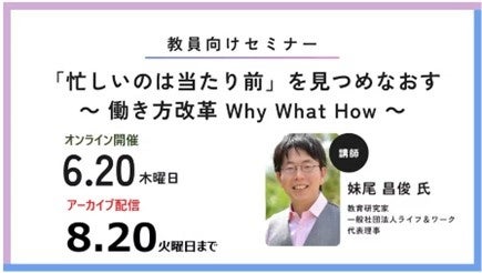 教育研究家の妹尾 昌俊 氏による、教員の働き方改革をテーマにしたセミナーのアーカイブを8月20日まで公開しています。