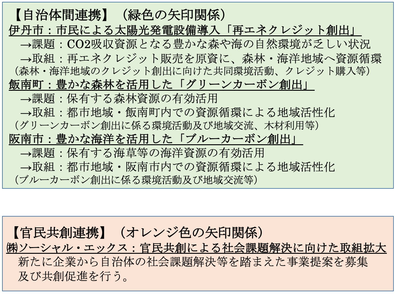 そこで、「都市自治体 伊丹市」「森林自治体 飯南町」「海洋自治体 阪南市」は、互いの地域特性を生かし補完し支え合う「地域循環共生」の考えを踏まえ、資源循環・環境保全活動等の交流を通じ、それぞれの地域における社会課題の解決により創出される「新たな価値を持ったカーボンクレジット(ソーシャルクレジット)」に取り組みます。