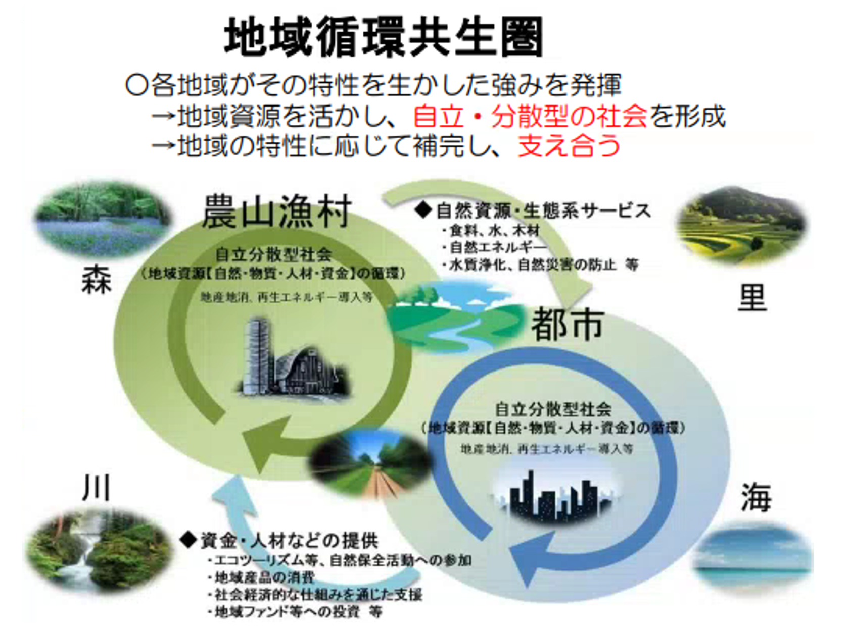 2018 年 4 月に閣議決定した第五次環境基本計画では、国連「持続可能な開発目標」(SDGs)や「パリ協定」といった世界を巻き込む国際な潮流や複雑化する環境・経済・社会の課題を踏まえ、複数の課題の統合的な解決という SDGs の考え方も活用した「地域循環共生圏」を提唱しております。「地域循環共生圏」とは、各地域が美しい自然景観等の地域資源を最大限活用しながら自立・分散型の社会を形成しつつ、地域の特性に応じて資源を補完し支え合うことにより、地域の活力が最大限に発揮されることを目指す考え方です。