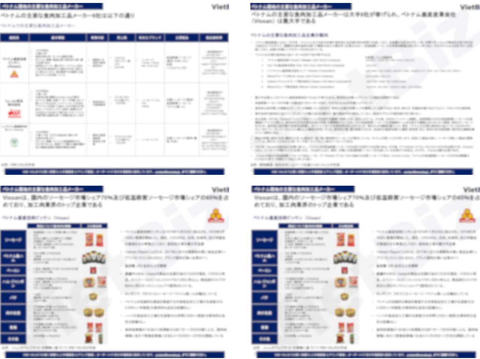 食肉加工企業の動向について情報を網羅。ベトナムにおける主要な食肉加工品プレーヤー詳細情報・商品情報などを記載。ベトナムにおいて主要なプレーヤーは6社が挙げられる。