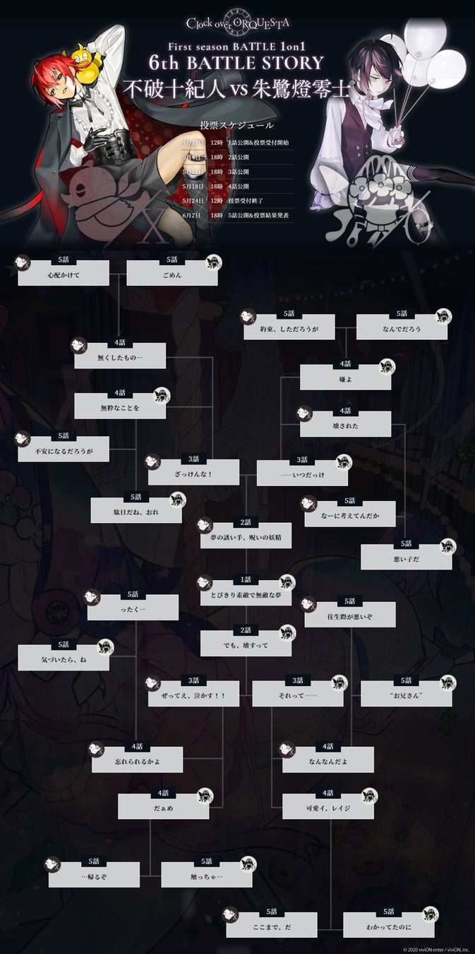 SNS連動型キャラクターソングプロジェクト『Clock over ORQUESTA(クロック・オーバー・オルケスタ)』(株式会社viviON、所在地:東京都千代田区、代表取締役:明石耕作) https://clockoverorquesta.com/ では、ユーザーの投票によって物語の展開とキャラクターバトルの勝敗が変化するバトルロイヤルを実施しています。4月27日より、First season BATTALEの最終戦となる、第6戦がスタートいたしました。